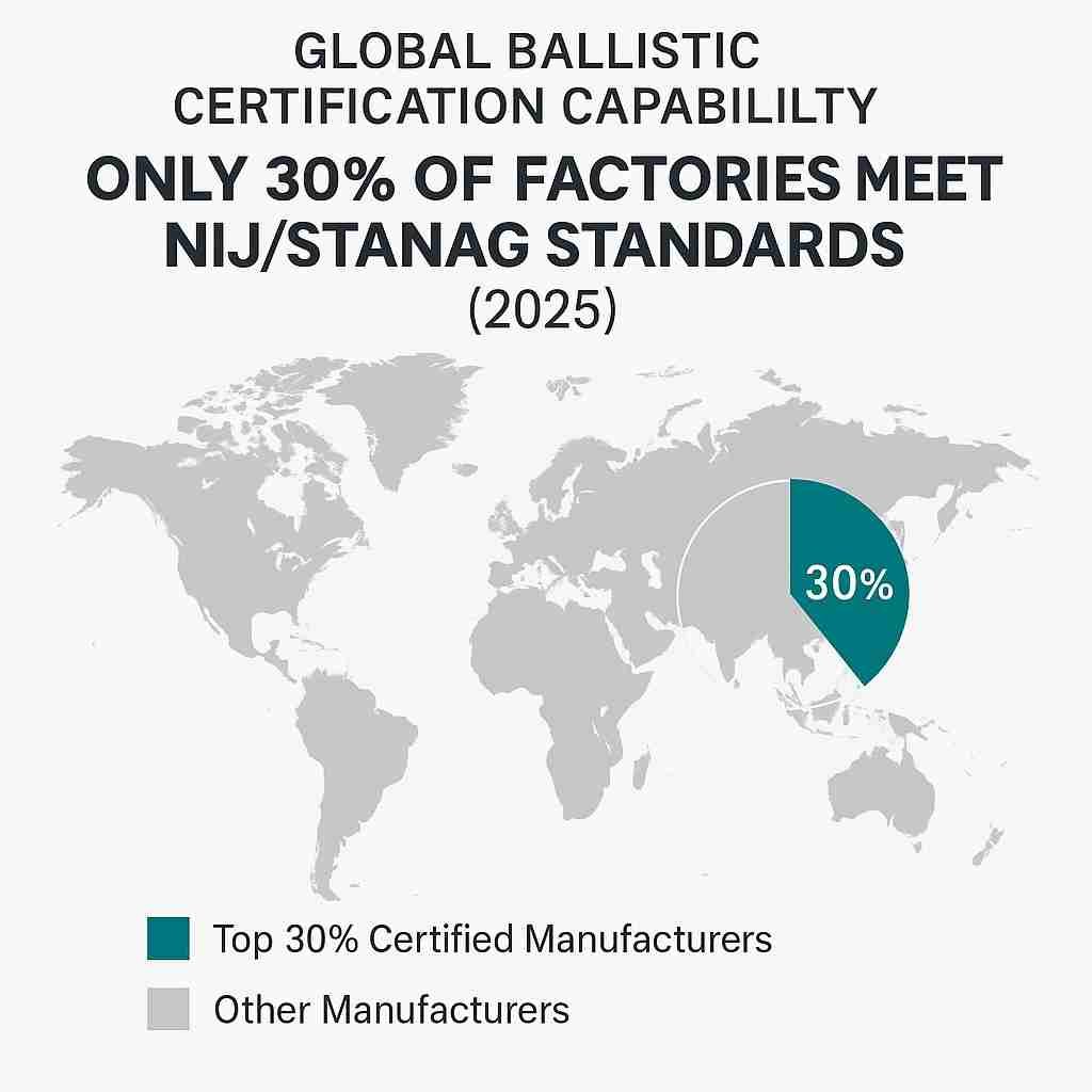 | Factories with official NIJ or STANAG certification capability | ≈30% | Source: Ballistic Protection Market Report, Mordor Intelligence (2024) | Only ~1/3 of ballistic OEMs have accredited test access; most rely on subcontracted labs |